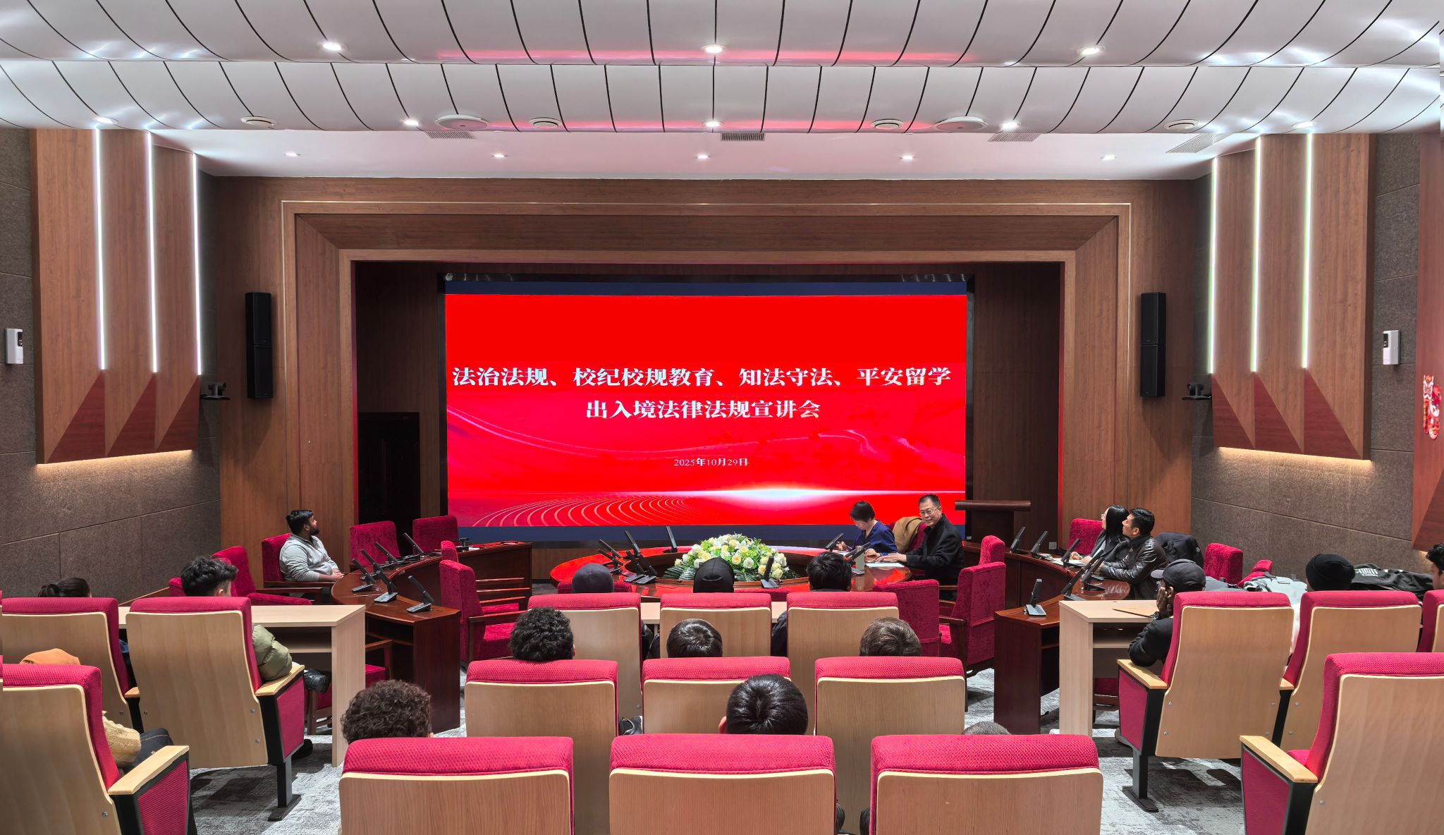 2025年10月29日下午,我校国际合作与交流处为2025级全体来华留学生举办法治宣讲。校党委统战部部长张东伟受邀为留学生宣讲《中华人民共和国教育法》《普通高等学校学生管理规定》《中华人民共和国境内外国人宗教活动管理规定实施细则》《高等学校接受外国留学生管理规定》和《互联网宗教信息服务管理办法》有关规定。校党委统战部副部长杨思乐、民族宗教科副科长李龙、校国际合作与交流处国际交流科科长刘媛媛参加。(通讯员 刘媛媛、李龙)